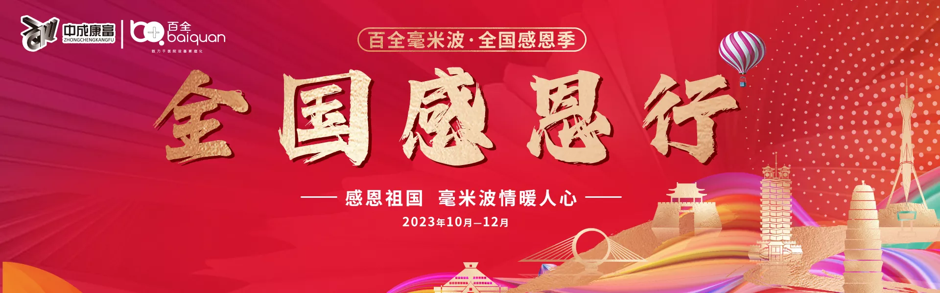 为赞美伟大祖国,进一步推广毫米波疗法,我们特将今年10月-12月定为“百全毫米波·全国感恩季”。在感恩季期间,我们将在全国各地开展百全毫米波·感恩行全国巡回活动。